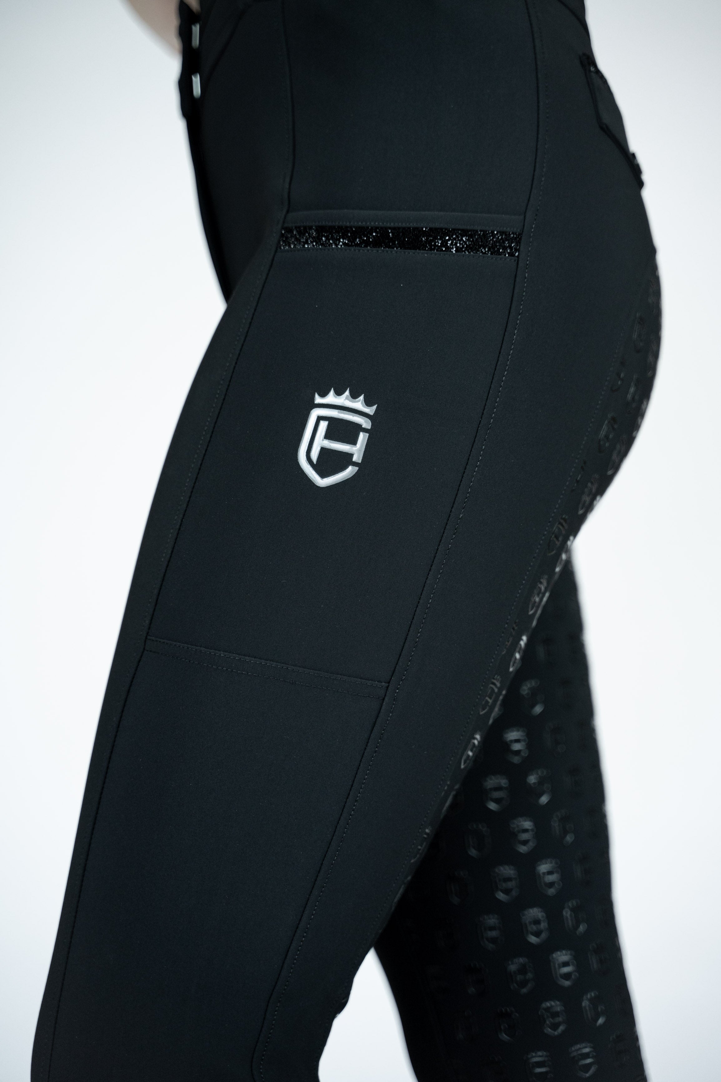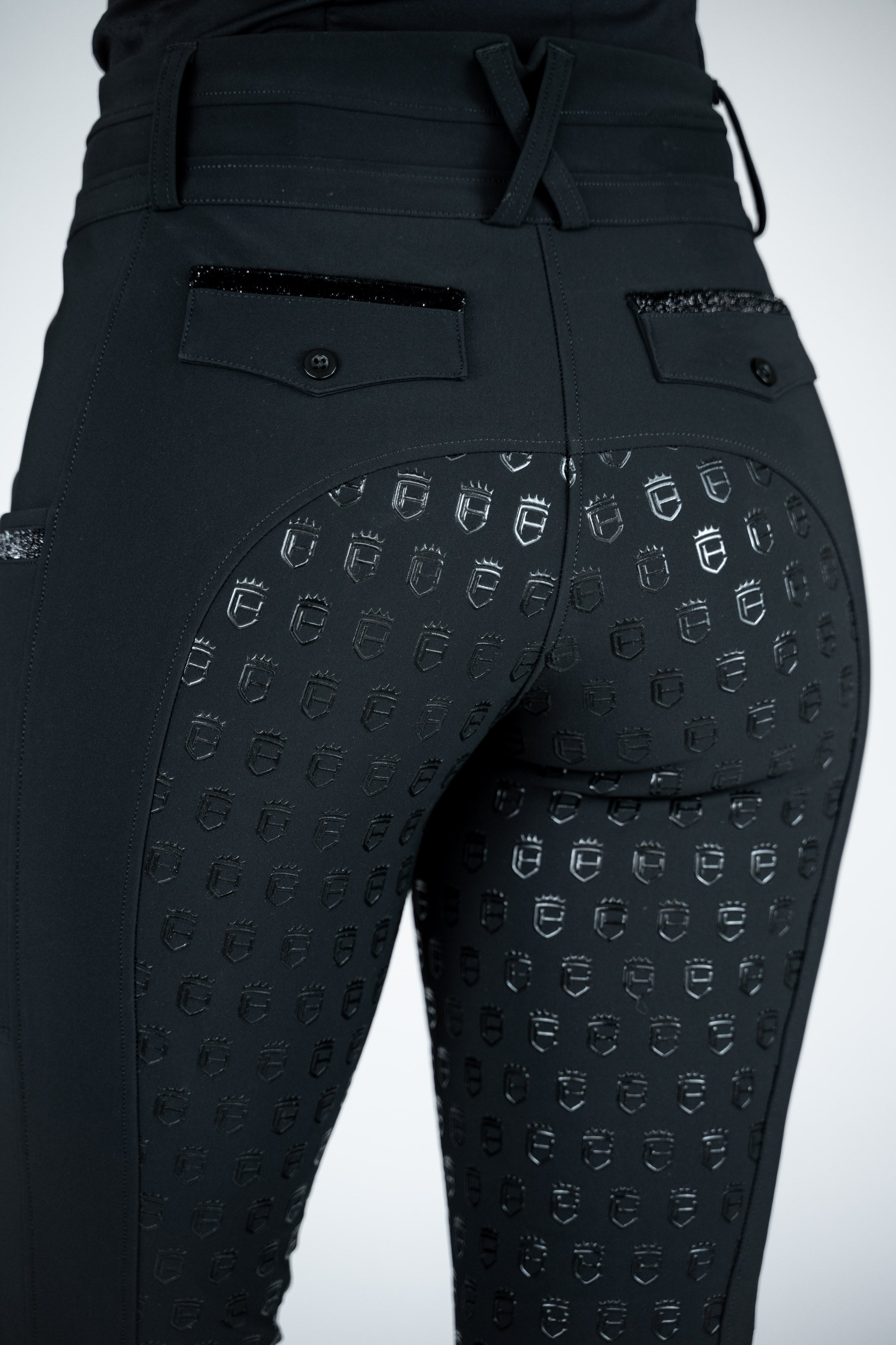 Der breite shaping Bund sorgt für sicheren Halt, während praktische Handytaschen auf beiden Seiten und dezente Glitzer-Details den Look stilvoll abrunden.