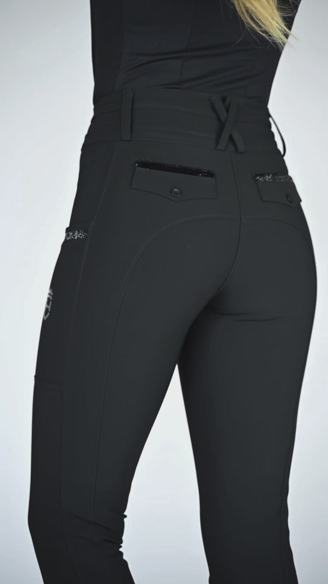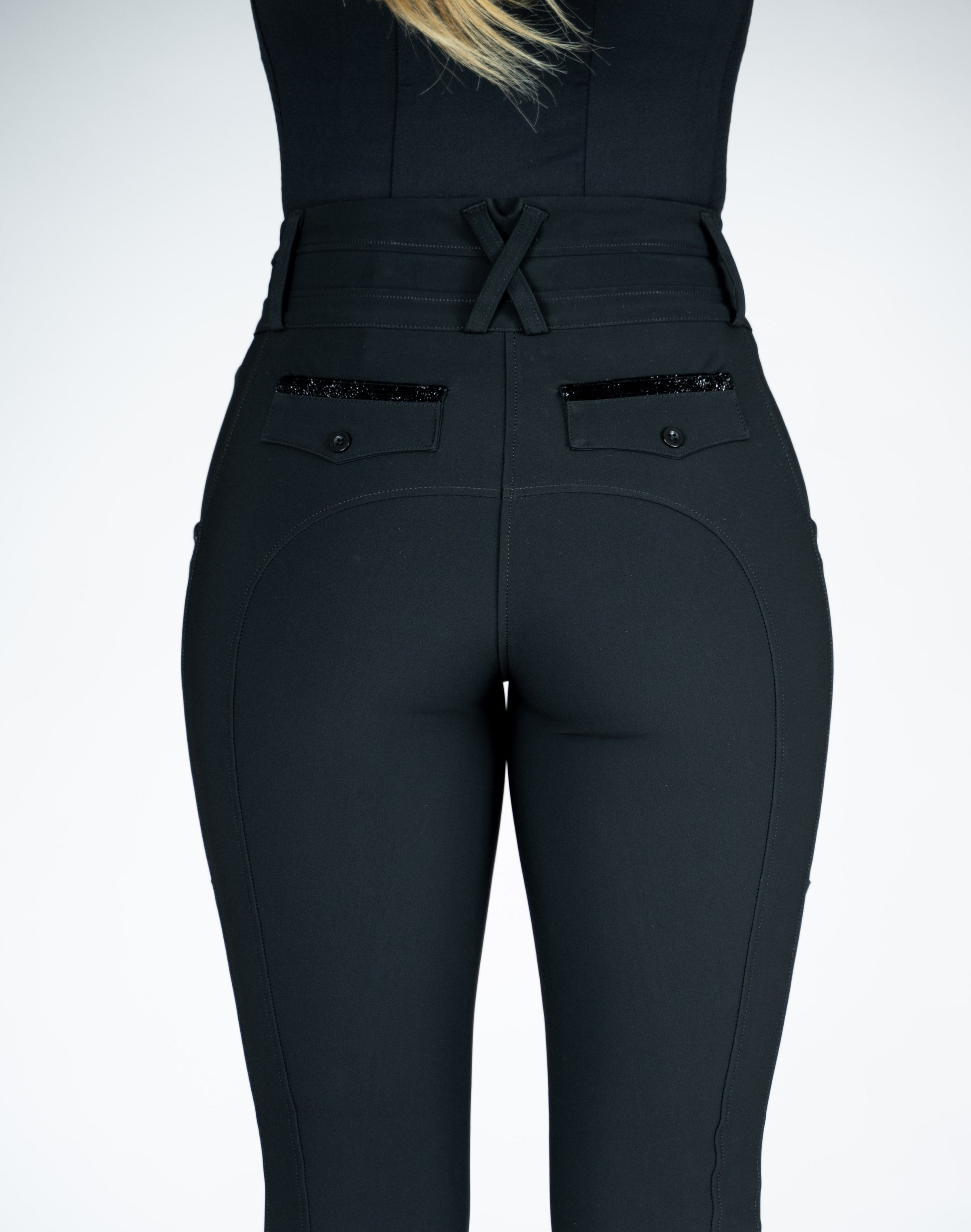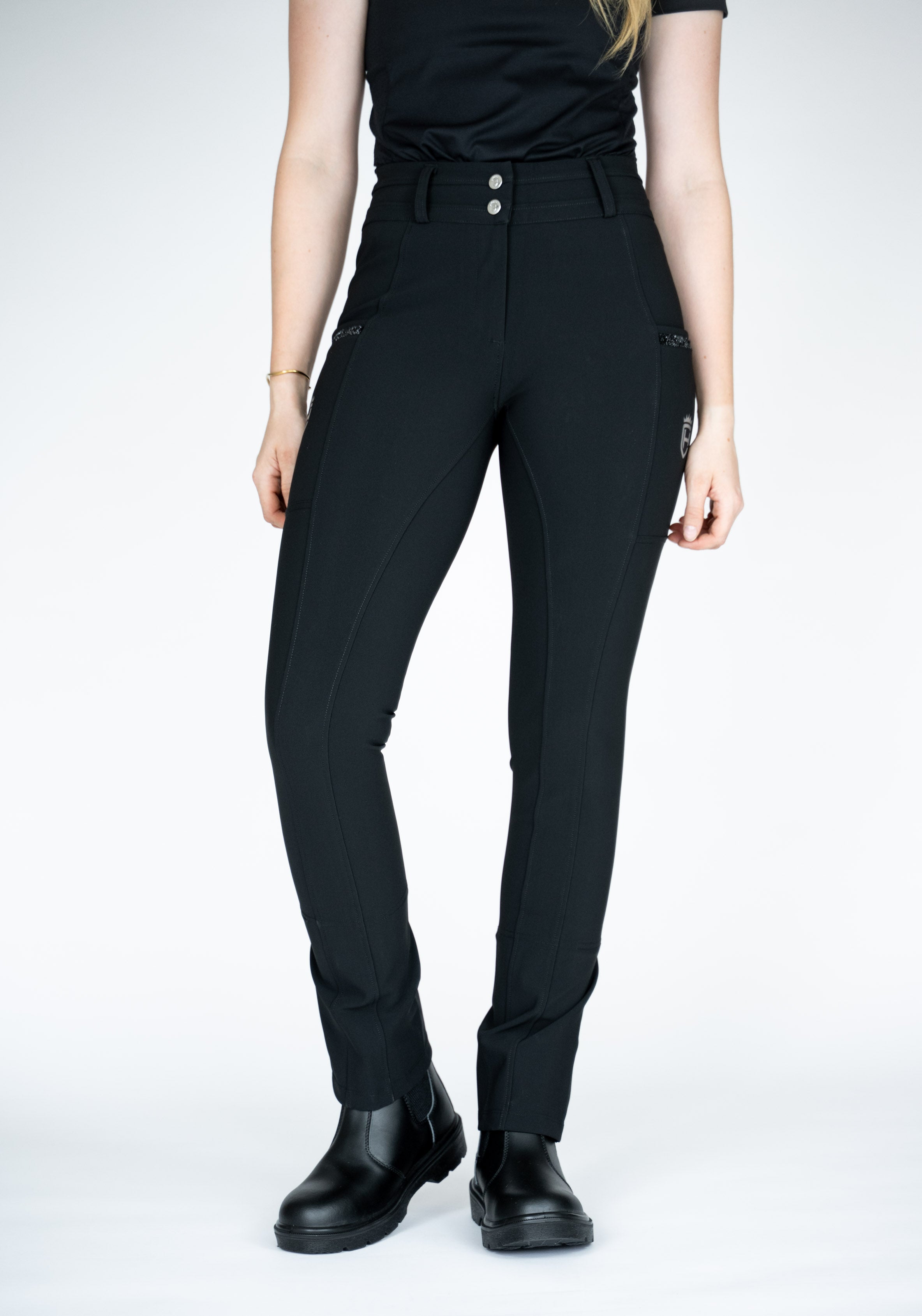 Der breite shaping Bund sorgt für sicheren Halt, während praktische Handytaschen auf beiden Seiten und dezente Glitzer-Details den Look stilvoll abrunden.
