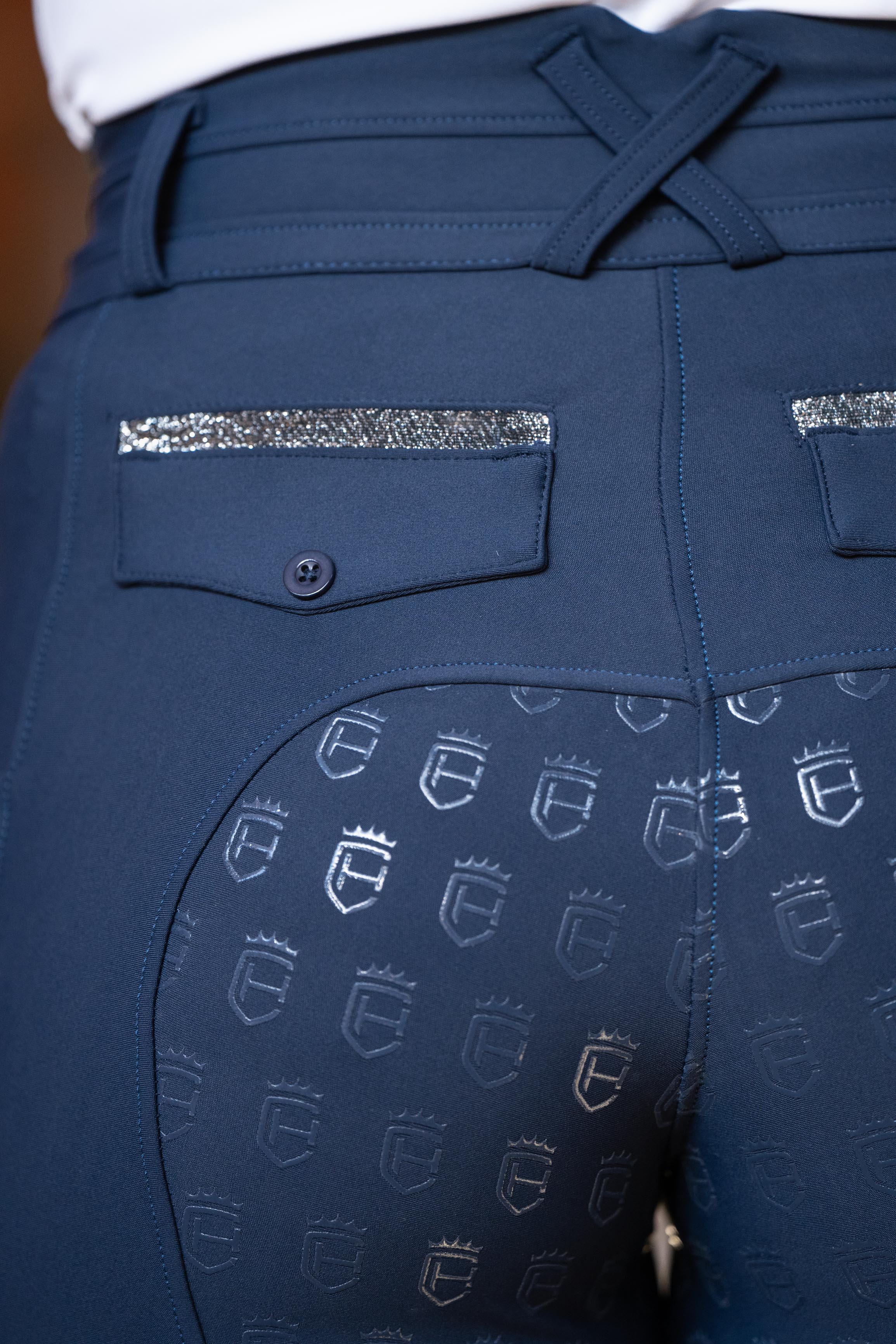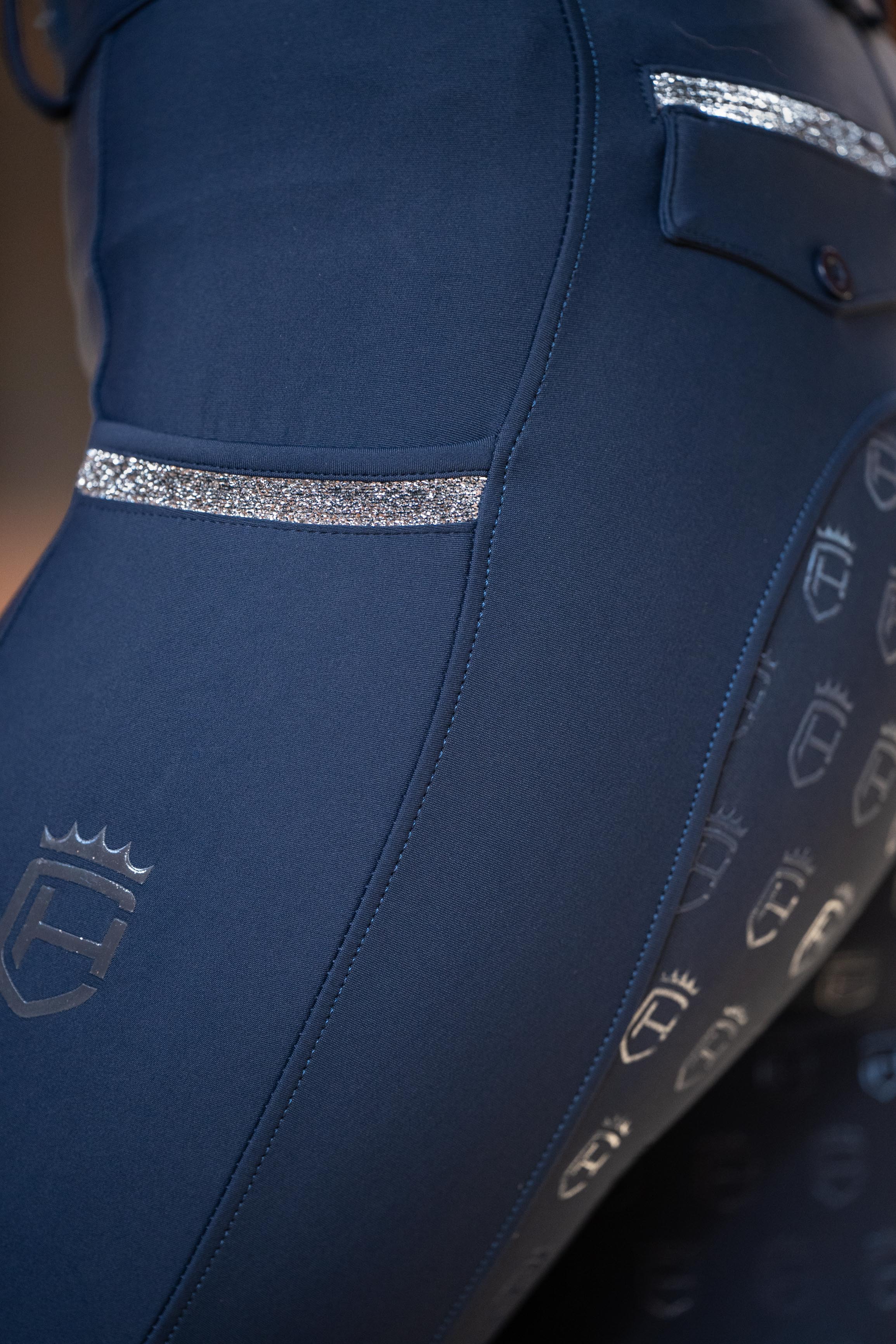 Diese exklusive Reithose vereint herausragendes Design mit höchster Funktionalität und bietet dir das Beste. Das 4-Wege-Stretch-Material garantiert unschlagbare Flexibilität und starken Kompressionseffekt, während die exzellente Verarbeitung für eine perfekte Passform und maximalen Tragekomfort sorgt. Der breite, hochwertige Bund bietet optimalen Halt und einen sicheren Sitz. Praktische Handytaschen mit stilvollen Glitzerakzenten verbinden Funktionalität und edlen Stil. Der Full-Grip-Silikonbesatz gewährleistet besten Halt im Sattel, während dezente Logodetails und Glitzerhighlights an Tasche und Gesäß das exklusive Design vollenden.