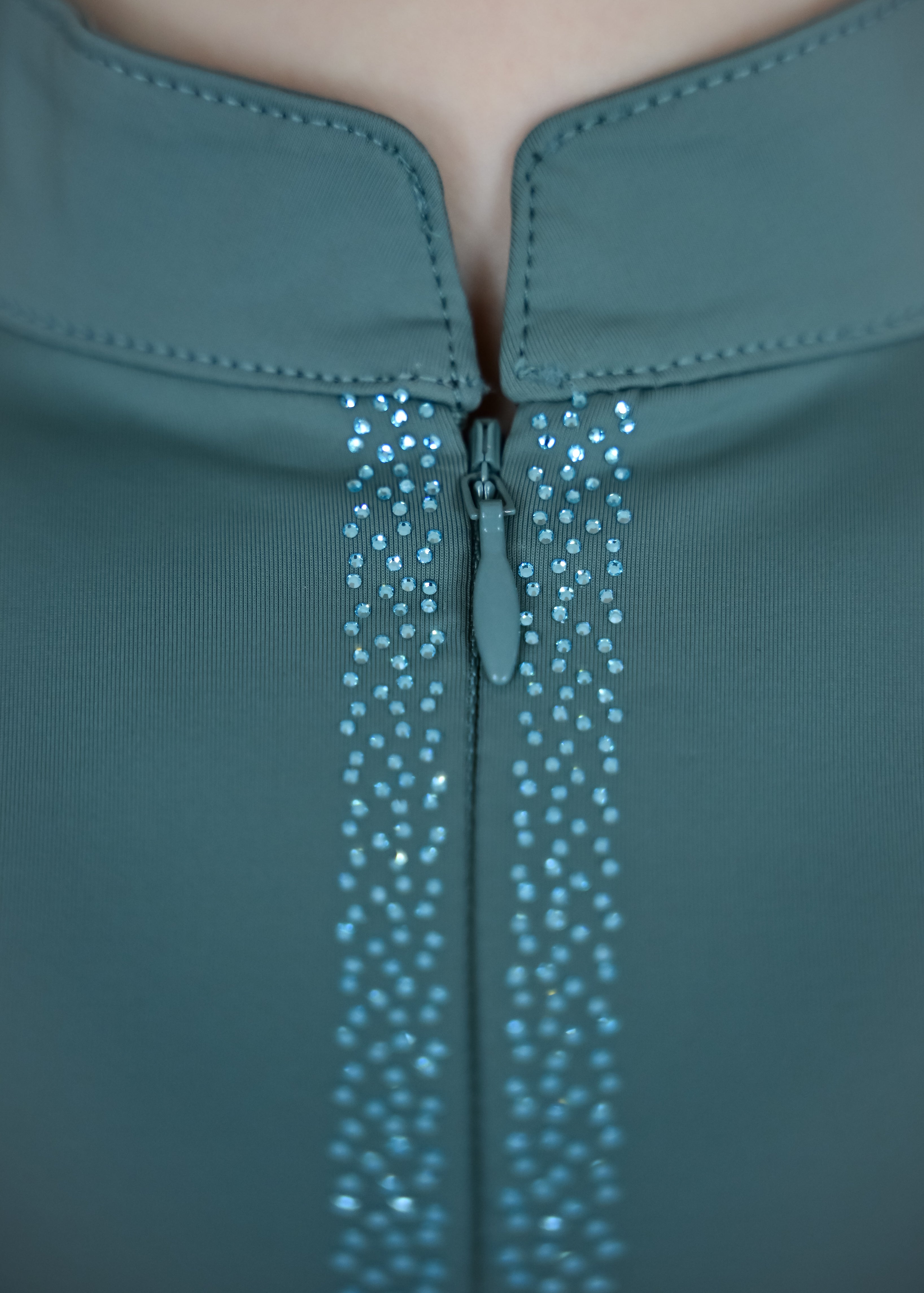 Dieses elegante Funktionsshirt vereint Stil und Tragekomfort auf höchstem Niveau. Der hohe Kragen mit dezentem Glitzerreißverschluss verleiht dem Shirt einen edlen Touch, während feine Strassdetails entlang der Vorderseite stilvolle Akzente setzen. Der atmungsaktive Stoff sorgt für ein angenehm leichtes Tragegefühl, während transparente Mesh-Einsätze an den Ärmeln eine moderne Note und optimale Luftzirkulation bieten. Ein besonderes Highlight ist der mit Strasssteinen verzierte CrownHorse-Schriftzug an den Ärmeln. Die körpernahe Passform liegt bequem am Körper an und rundet das Design perfekt ab.