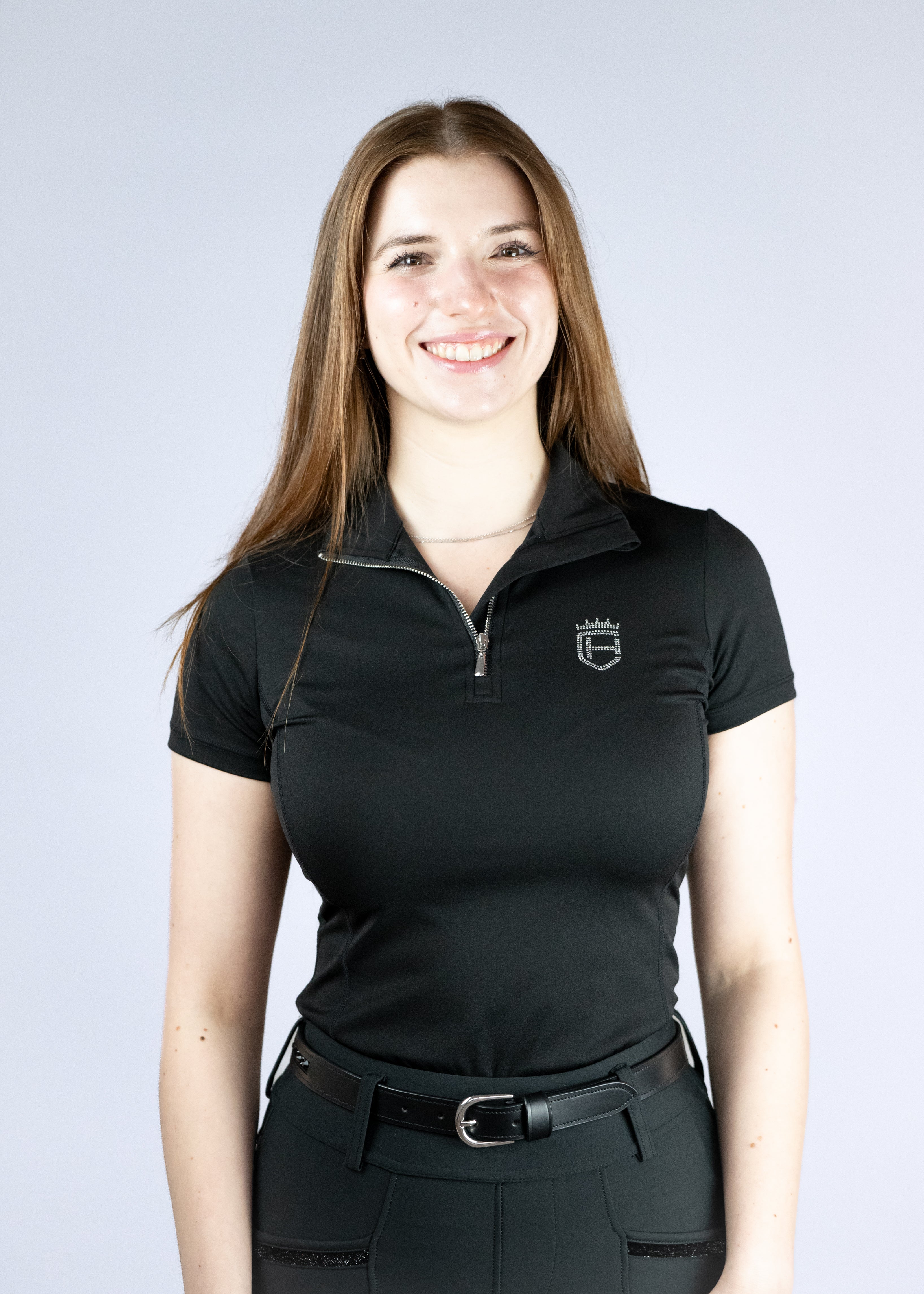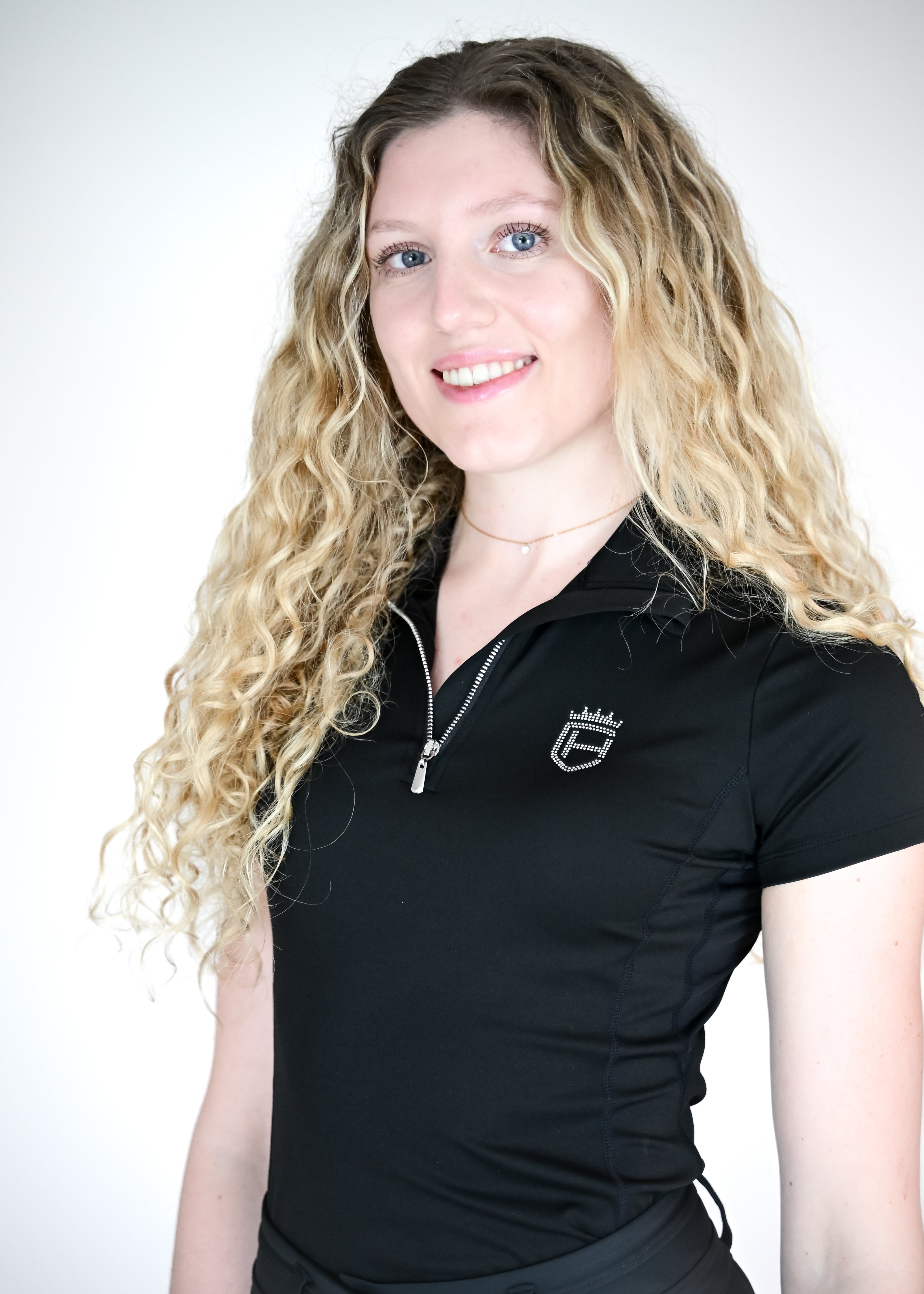 Das schwarze Funktions-T-Shirt überzeugt mit atmungsaktivem Material für ein angenehmes Tragegefühl bei jeder Aktivität. Der sportliche V-Ausschnitt mit edlem Halfzip-Reißverschluss bietet flexible Belüftung und verleiht dem Design einen modernen Touch. Die elastische Passform bietet maximale Bewegungsfreiheit und schmiegt sich angenehm an den Körper an. Unser dezentes Logo mit funkelnden Strasssteinen auf der Brust rundet den Look stilvoll ab.