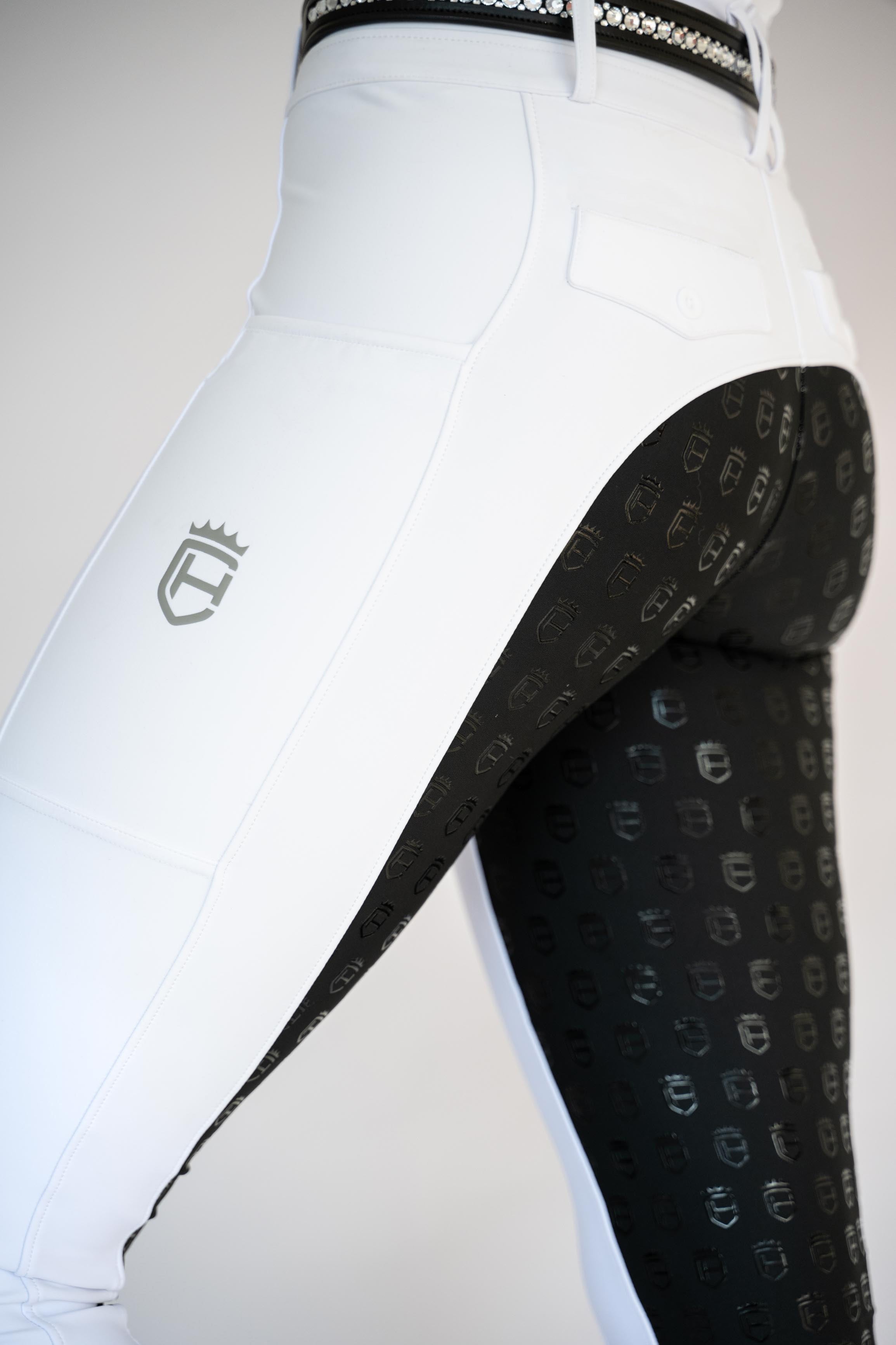 Der breite, hochwertige Bund bietet optimalen Halt und einen sicheren Sitz. Der Full-Grip-Silikonbesatz gewährleistet besten Halt im Sattel, während dezente Logodetails und Glitzerhighlights an Tasche und Gesäß das exklusive Design vollenden.